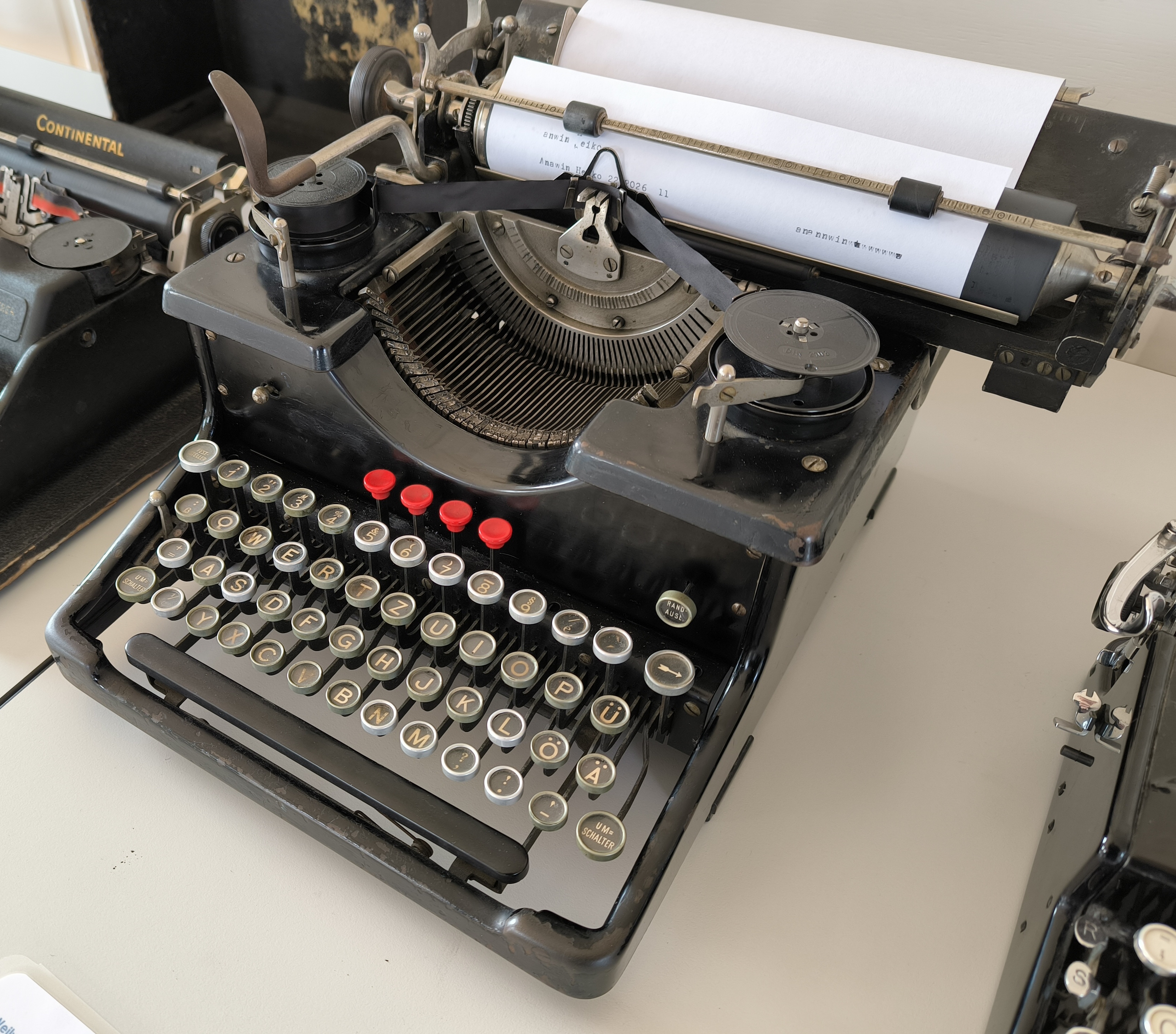 Diese elegante Büroschreibmaschine fällt vor allem durch die aufgesetzten Farbbandspulen und natürlich die vier roten Tasten auf. Diese dienten dazu, verschiedene Tabulatorstopps anzusteuern.