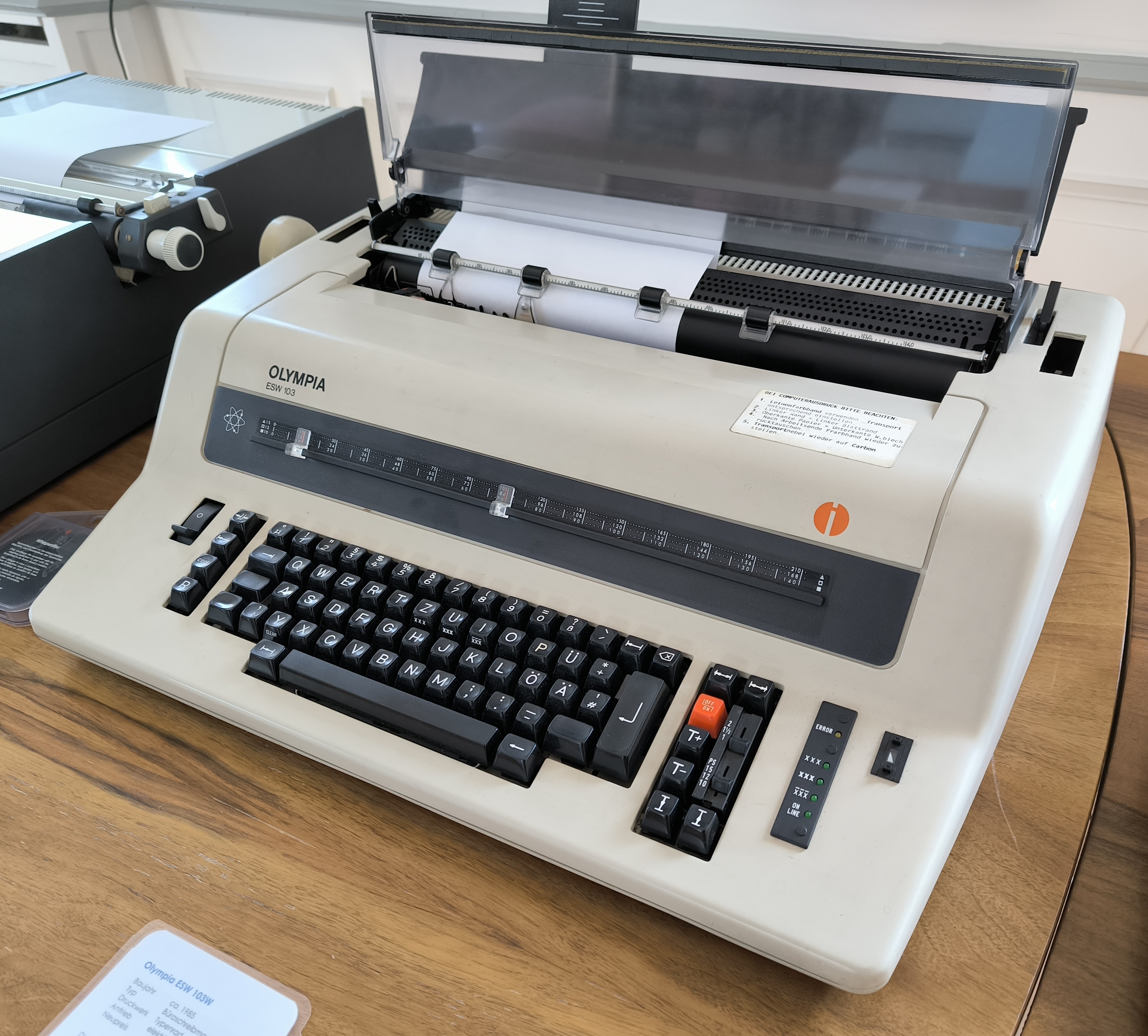 Diese robuste Büroschreibmaschine hat auf der Rückseite eine Centronics-Schnittstelle und konnte daher auch als Typenraddrucker an einem Computer angeschlossen werden. Über die rote Online-Taste kann man zwischen Drucker- und Schreibmaschinenbetrieb umschalten.