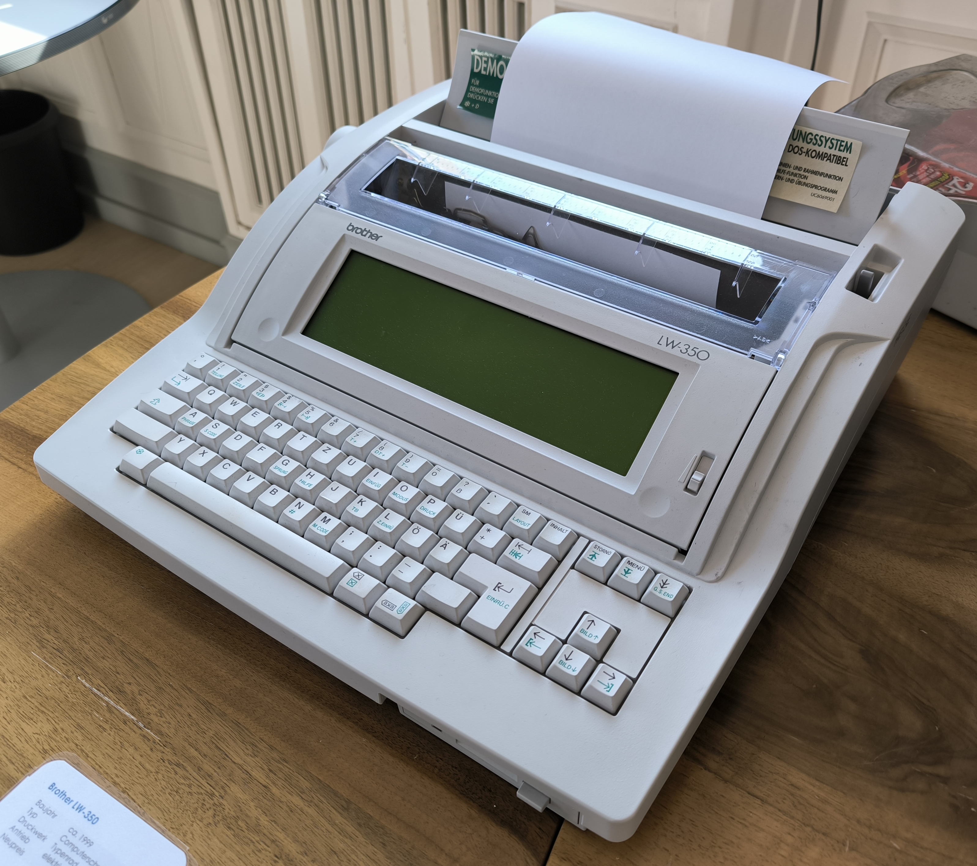 Diese Maschine hat einen Computer integriert. Man kann ganz normal schreiben oder auch einen Text zunächst über den Bildschirm erfassen und dann ausdrucken. Die Maschine ist mit sehr vielen Funktionen ausgestattet, die aber nicht darüber hinwegtäuschen können, dass ein richtiger Computer doch wesentlich angenehmer zu bedienen ist.