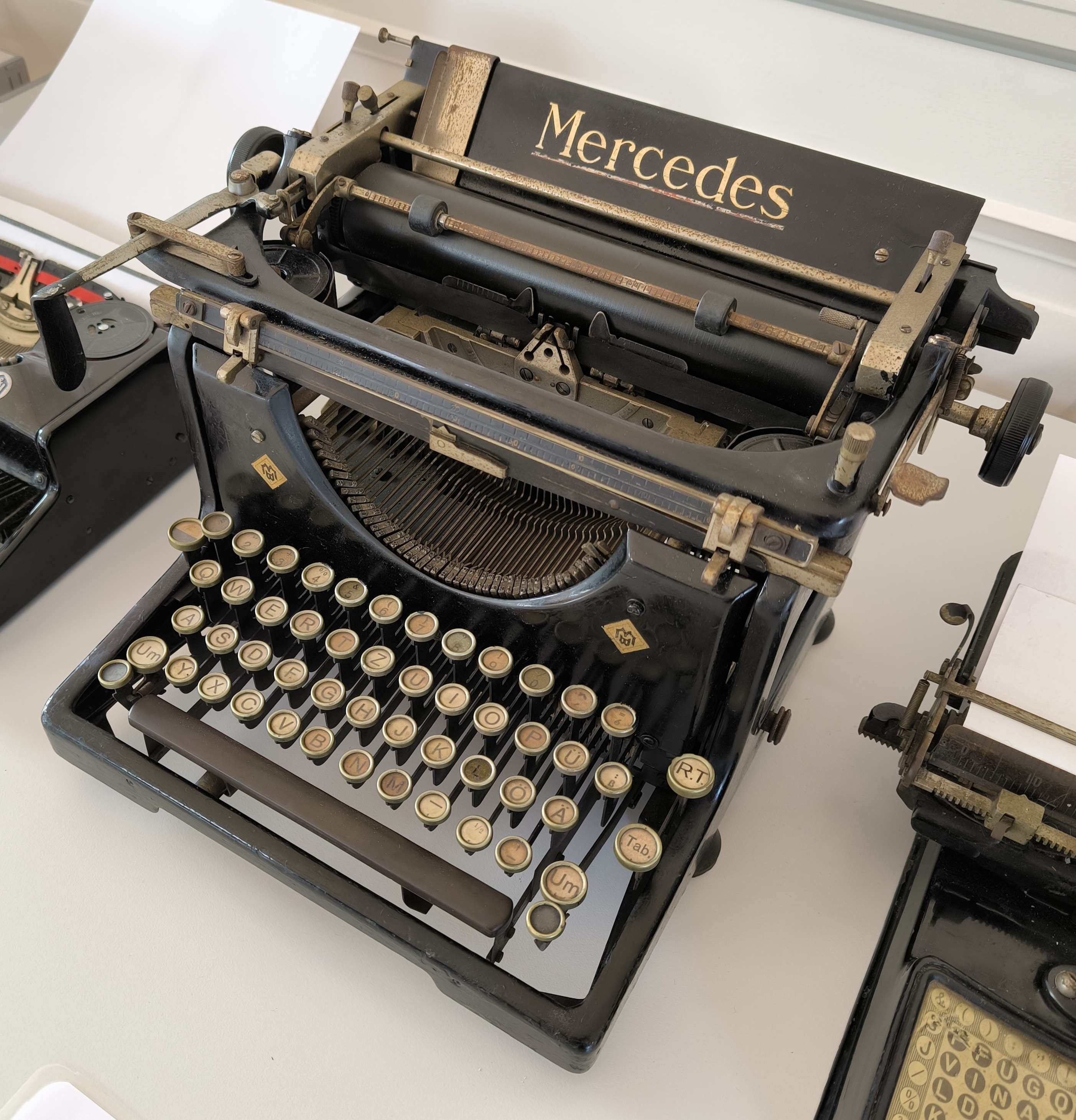 Mercedes baute in Zella-Mehlis sowohl Schreib- als auch Rechenmaschinen. Diese Büroschreibmaschine hat sogenannte "Glastasten", die Tastenbeschriftung ist also unter einer runden Glasscheibe mit einem Metallring drumherum. Die Firma hatte nichts mit dem Autohersteller zu tun, außer dass sie für die Verwendung des Namens Lizenzgebühren zahlen mussten.